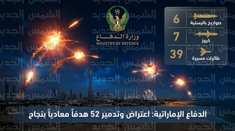 الدفاع الإماراتية تعلن اعتراض 52 هدفاً معادياً وتؤكد كفاءة منظوماتها في تدمير الصواريخ والمسيرات