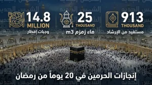 توزيع 14.8 مليون وجبة إفطار و25 ألف متر مكعب من ماء زمزم لضيوف الرحمن خلال 20 يوماً من رمضان