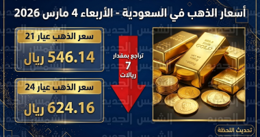 تراجع اسعار الذهب اليوم في السعودية الأربعاء 4-3-2026 بمقدار 7 ريالات للجرام