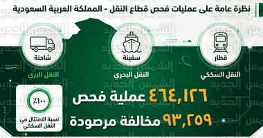 أعلنت الهيئة العامة للنقل اليوم، الخميس 5 مارس 2026، عن التقرير الختامي لنتائج أعمال الرقابة الميدانية على أنشطة النقل البري والبحري والسككي خلال شهر فبراير الماضي، وأظهرت البيانات تنفيذ أكثر من 464 ألف عملية فحص لضمان امتثال الناقلين للأنظمة والاشتراطات الفنية، ورفع جودة الخدمات المقدمة للمستفيدين في كافة مناطق المملكة.