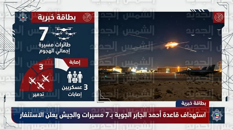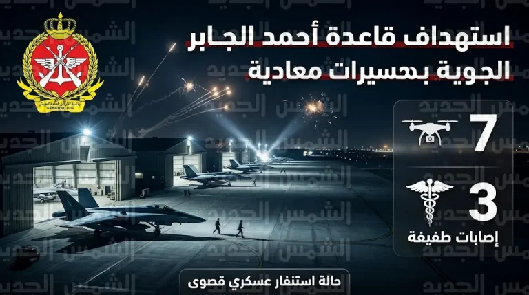 استهداف قاعدة أحمد الجابر الجوية بمسيرات معادية والدفاع الكويتية تعلن إصابة 3 عسكريين