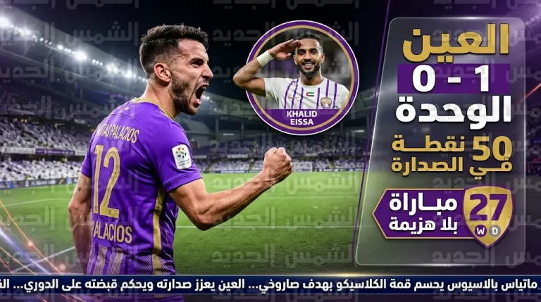 بصاروخية بالاسيوس.. العين يهزم الوحدة ويقترب من تحطيم رقم الجزيرة التاريخي بـ 27 مباراة دون خسارة
