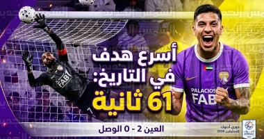 سجله لاعب نادي العين “بالاسيوس” في مرمى الوصل بعد مرور 61 ثانية فقط من انطلاق المباراة بتاريخ 13 مارس 2026.