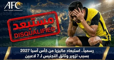 أعلن الاتحاد الآسيوي لكرة القدم اليوم الثلاثاء 17 مارس 2026، عن قرار انضباطي حاسم هز أركان القارة الصفراء، يقضي باستبعاد المنتخب الماليزي نهائياً من سباق التأهل إلى نهائيات كأس آسيا 2027 المقرر إقامتها في المملكة العربية السعودية، جاء هذا القرار الصادم عقب تحقيقات موسعة أثبتت عدم قانونية مشاركة 7 لاعبين ضمن صفوف المنتخب الماليزي بسبب تزوير وثائق التجنيس، مما ترتب عليه قلب نتائج مبارياتهم السابقة أمام نيبال وفيتنام إلى خسائر اعتبارية بنتيجة (3-0).