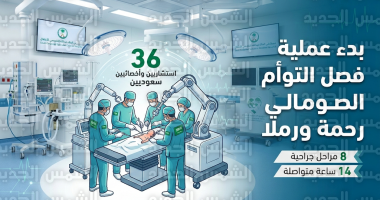 تنفيذاً لتوجيهات خادم الحرمين الشريفين الملك سلمان بن عبدالعزيز آل سعود، وصاحب السمو الملكي الأمير محمد بن سلمان بن عبدالعزيز ولي العهد رئيس مجلس الوزراء -حفظهما الله-، بدأ الفريق الطبي والجراحي المختص اليوم الخميس 5 مارس 2026 (الموافق 16 شعبان 1447هـ)، عملية فصل التوأم السيامي الصومالي “رحمة ورملا” في العاصمة الرياض.