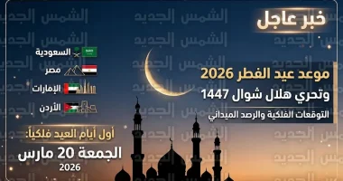 تترقب الشعوب العربية والإسلامية إعلان ثبوت رؤية هلال شهر شوال لتحديد أول أيام عيد الفطر المبارك لعام 2026 – 1447هـ، وتشير الحسابات الفلكية إلى أن يوم الجمعة الموافق 20 مارس 2026 هو غرة شهر شوال وأول أيام العيد في أغلب الدول، وسط استنفار رسمي من المحاكم العليا ودور الإفتاء لتحري الهلال شرعياً.