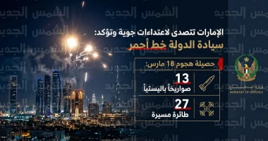 أعلنت وزارة الدفاع الإماراتية، اليوم الأربعاء 18 مارس 2026، عن نجاح منظومات الدفاع الجوي في التصدي لسلسلة من الاعتداءات السافرة، حيث تمكنت من اعتراض وتدمير 13 صاروخاً باليستياً و27 طائرة مسيرة كانت تستهدف أراضي الدولة، في تأكيد جديد على كفاءة وجاهزية القوات المسلحة في حماية الأجواء الوطنية والذود عن سيادة الإمارات.