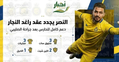 في متابعة دقيقة للحالة الصحية للحارس، تأكد خضوع راغد النجار يوم الأحد الماضي 15 مارس 2026 لعملية جراحية ناجحة في الرباط الصليبي بمستشفى “سبيتار” للطب الرياضي في العاصمة القطرية الدوحة، وجاء قرار الإدارة النصراوية بفتح ملف التجديد فور نجاح الجراحة كرسالة دعم مباشرة للاعب، مؤكدة على ثقة الجهاز الفني بقيادة “كاسترو” في قدرات النجار على العودة للمستطيل الأخضر بقوة أكبر.