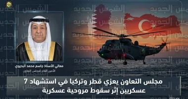 أعرب معالي الأستاذ جاسم محمد البديوي، الأمين العام لمجلس التعاون لدول الخليج العربية، اليوم الثلاثاء 24 مارس 2026، عن أحر التعازي وأصدق مشاعر المواساة إلى دولة قطر والجمهورية التركية، وذلك في أعقاب حادثة سقوط مروحية عسكرية تابعة لوزارة الدفاع القطرية، والتي أسفرت عن استشهاد سبعة من أفراد القوات المسلحة القطرية والقوات المشتركة القطرية التركية.