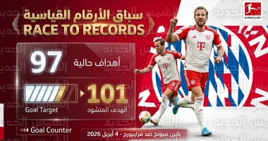 يسعى بايرن ميونخ تحت قيادة مدربه البلجيكي فينسن كومباني إلى تدوين اسمه في سجلات التاريخ مجدداً خلال ما تبقى من منافسات عام 2026، فالفريق الذي سجل 97 هدفاً حتى الآن، يحتاج إلى 5 أهداف فقط لتحطيم الرقم القياسي الأسطوري المسجل باسم الجيل الذهبي للنادي في موسم 1971-1972، والذي توقف عند 101 هدف.