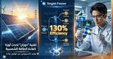 ج: الرقم 130% يشير إلى “الكفاءة الكمية الخارجية”، وهي تعني أن كل 100 فوتون تسقط على الخلية تنتج 130 إلكتروناً، وذلك بفضل تقنية الانشطار الأحادي التي تقسم الفوتون عالي الطاقة لإنتاج جسيمين من الطاقة بدلاً من واحد.