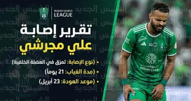 أوضح المصدر الطبي في “الراقي” أن الإصابة حدثت خلال الدقائق الأخيرة من مواجهة المنتخب السعودي الودية أمام صربيا، حيث دخل مجرشي كبديل قبل أن يشعر بآلام عضلية حادة، وبناءً على مدة الغياب المقدرة بـ 3 أسابيع، سيخضع اللاعب لبرنامج تأهيلي مكثف في عيادة النادي بجدة لضمان التئام التمزق العضلي بشكل كامل وتجنب حدوث أي مضاعفات مستقبلاً.