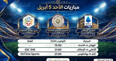 تترقب الجماهير الرياضية غداً الأحد، الموافق 5 أبريل 2026، حزمة من المواجهات الحاسمة في مختلف الملاعب المحلية والعالمية، وتتنوع الإثارة ما بين صراعات الصدارة في دوري روشن السعودي للمحترفين، وقمم الدوريات الأوروبية التي تدخل مراحلها الحاسمة، بالإضافة إلى الصدامات الجماهيرية المرتقبة في الدوري المصري الممتاز.