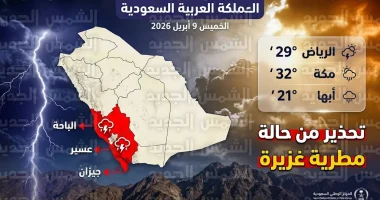 أصدر المركز الوطني للأرصاد تقريره اليومي حول حالة الطقس في المملكة العربية السعودية اليوم الخميس 9 أبريل 2026 (الموافق 21 شوال 1447 هـ)، متوقعاً استمرار هطول أمطار رعدية تتراوح بين المتوسطة والغزيرة على أجزاء واسعة من البلاد، وأكد التقرير أن هذه الحالة الجوية قد تؤدي إلى جريان السيول وتراكم المياه في الأودية والمناطق المنخفضة، مصحوبة بزخات من البرد ورياح نشطة قوية تثير الأتربة والغبار وتحد من مدى الرؤية الأفقية.