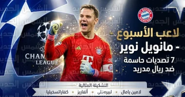 أعلن الاتحاد الأوروبي لكرة القدم “يويفا” رسمياً، اليوم الخميس 9 أبريل 2026، عن فوز الحارس الألماني المخضرم مانويل نوير، قائد بايرن ميونخ، بجائزة أفضل لاعب في جولة ذهاب ربع نهائي دوري أبطال أوروبا لعام 2026، جاء هذا التتويج بعد الأداء الأسطوري الذي قدمه نوير في مواجهة ريال مدريد على ملعب “سانتياجو برنابيو”، والتي انتهت بتفوق العملاق البافاري بنتيجة (2-1).