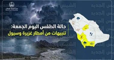 | نجران، جازان، عسير، الباحة | أمطار متوسطة إلى غزيرة، جريان سيول، وزخات برد. |