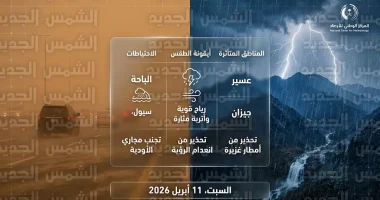 أصدر المركز الوطني للأرصاد تقريره اليومي حول حالة الطقس المتوقعة اليوم السبت 11 أبريل 2026 (الموافق 24 شوال 1447هـ)، مؤكداً استمرار موجة التقلبات الجوية على معظم مناطق المملكة، وأشار المركز إلى أن الفرصة لا تزال مهيأة لهطول أمطار رعدية غزيرة تؤدي إلى تدفق السيول ومصحوبة بزخات من البرد ورياح نشطة.