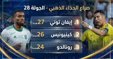 نجح الأسطورة البرتغالي كريستيانو رونالدو في تقليص الفارق مع المتصدرين بعد تسجيله هدفاً في شباك الأخدود اليوم، ليرفع رصيده إلى 24 هدفاً في المركز الثالث، ويبقي على آماله في المنافسة على الحذاء الذهبي لهذا الموسم قبل 6 جولات من النهاية.