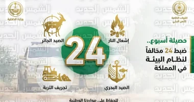 كشفت الجهات الأمنية في المملكة العربية السعودية، اليوم الأحد 12 أبريل 2026 (الموافق 25 شوال 1447هـ)، عن حصيلة العمليات الرقابية لإنفاذ نظام البيئة خلال الأسبوع المنصرم، وأسفرت الجهود الميدانية المشتركة بين القوات الخاصة للأمن البيئي والمديرية العامة لحرس الحدود عن ضبط 24 مخالفاً ارتكبوا تجاوزات متنوعة هددت السلامة البيئية والحياة الفطرية في عدد من المناطق والمحميات الملكية.