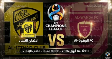 | الاتحاد السعودي vs الوحدة الإماراتي | الثلاثاء 14 أبريل 2026 | 09:00 مساءً | ملعب الإنماء |