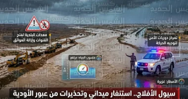 جريان السيول في أودية الأفلاج والدفاع المدني يحذر من المجازفة بعبورها وسط استمرار الحالة الجوية