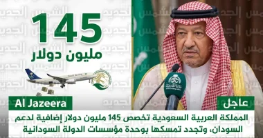 أعلنت المملكة اليوم 16 أبريل 2026 عن تخصيص 145 مليون دولار أمريكي كدعم إضافي مخصص حصراً لخطة الاستجابة الإنسانية في السودان للعام الحالي.