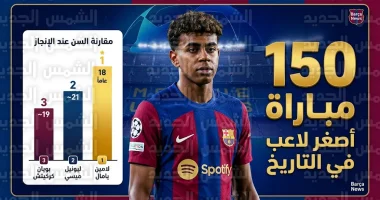 - لامين يامال يصبح أصغر لاعب في تاريخ برشلونة يصل إلى 150 مباراة رسمية بعمر 18 عاماً فقط.