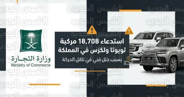 أصدرت وزارة التجارة السعودية اليوم الخميس 16 أبريل 2026 (الموافق 28 شوال 1447هـ)، بياناً عاجلاً يقضي باستدعاء 18,708 مركبة حديثة من طرازات “تويوتا” و”لكزس”، وذلك ضمن جهودها الرقابية لضمان سلامة المستهلكين ومعالجة العيوب المصنعية فور رصدها بالتعاون مع الشركات المصنعة.