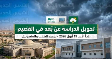 أعلنت الجهات التعليمية في منطقة القصيم، متمثلة في الجامعة والإدارة العامة للتعليم، عن صدور قرارات رسمية تقضي بتحويل الدراسة من الحضور المقري إلى نظام الدراسة “عن بُعد” ليوم غدٍ الأحد 19 أبريل 2026م، وجاء هذا القرار بناءً على التقارير الصادرة من المركز الوطني للأرصاد التي تشير إلى تقلبات جوية مرتقبة في المنطقة، وحرصاً على سلامة الطلاب والطالبات والهيئتين التعليمية والإدارية.
