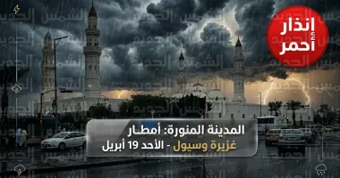 أصدر المركز الوطني للأرصاد تنبيهاً متقدماً برفع درجة الإنذار إلى اللون “الأحمر” في منطقة المدينة المنورة اليوم الأحد 19 أبريل 2026 (الموافق 2 شوال 1447 هـ)، جراء توقعات بهطول أمطار غزيرة تزداد حدتها خلال الساعات القادمة، مما يستوجب أخذ الحيطة والحذر من قبل السكان والمتنزهين.