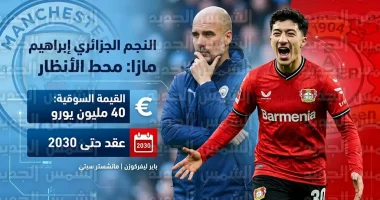 في تحديث جديد اليوم الأحد 19 أبريل 2026، حسمت التقارير الصحفية الإنجليزية الجدل المثار حول رغبة نادي مانشستر سيتي في التعاقد مع الدولي الجزائري الصاعد، إبراهيم مازا، صانع ألعاب نادي باير ليفركوزن الألماني، وتأتي هذه الأنباء في وقت حساس من الموسم الكروي الحالي، تزامناً مع التقارير التي تؤكد اقتراب رحيل النجم البرتغالي برناردو سيلفا عن صفوف “السيتيزنز” بنهاية الموسم، مما يضع بيب غوارديولا أمام ضرورة إيجاد البديل المبتكر.