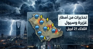 أصدر المركز الوطني للأرصاد تقريره اليومي حول حالة الطقس المتوقعة اليوم الثلاثاء 21 أبريل 2026 (الموافق 4 ذو القعدة 1447 هـ)، مؤكداً استمرار الحالة المطرية التي تشهدها عدة مناطق بالمملكة، ويُتوقع هطول أمطار رعدية تتراوح بين المتوسطة والغزيرة، مما قد يؤدي إلى جريان السيول، مع تساقط البرد ونشاط الرياح المثيرة للأتربة التي تحد من مدى الرؤية الأفقية.