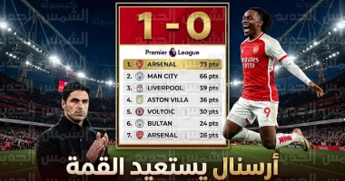 وعاد “الجانرز” إلى قمة الجدول مستفيداً من هذا الانتصار الثمين، ليرفع رصيده إلى 73 نقطة، متفوقاً بفارق 3 نقاط عن ملاحقه المباشر مانشستر سيتي، الذي يمتلك مباراة مؤجلة، وتأتي هذه العودة للصدارة بعد أن فقدها الفريق مؤقتاً في منتصف الأسبوع الماضي.