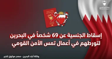 أعلنت الجهات الرسمية في مملكة البحرين، اليوم الاثنين 27 أبريل 2026 (الموافق 10 ذو القعدة 1447 هـ)، عن صدور قرار يقضي بإسقاط الجنسية عن 69 شخصاً من أصول غير بحرينية، وجاء هذا القرار بعد ثبوت تورط المدانين في أعمال تضر بمصالح الدولة العليا، شملت التخابر مع جهات أجنبية معادية وإظهار الدعم الصريح للاعتداءات التي استهدفت المملكة مؤخراً.