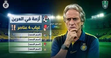 يواجه الجهاز الفني لنادي النصر بقيادة البرتغالي خورخي جيسوس تحدياً كبيراً في اختيار التشكيل الأساسي قبل مواجهة الغد، خاصة في خط الدفاع وحراسة المرمى، حيث تأكد غياب 4 عناصر عن الموقعة المرتقبة: