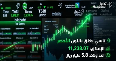 أنهى مؤشر الأسهم السعودية الرئيسي “تاسي” تعاملاته اليوم الأربعاء 29 أبريل 2026 (الموافق 12 ذو القعدة 1447 هـ) باللون الأخضر، محققاً ارتفاعاً قدره 58.12 نقطة، ليغلق عند مستوى 11238.07 نقطة، وشهدت الجلسة زخماً في قيم التداولات التي بلغت نحو 5.8 مليارات ريال، مما يعكس استقرار الثقة في تداولات السوق المالية السعودية لهذا اليوم.
